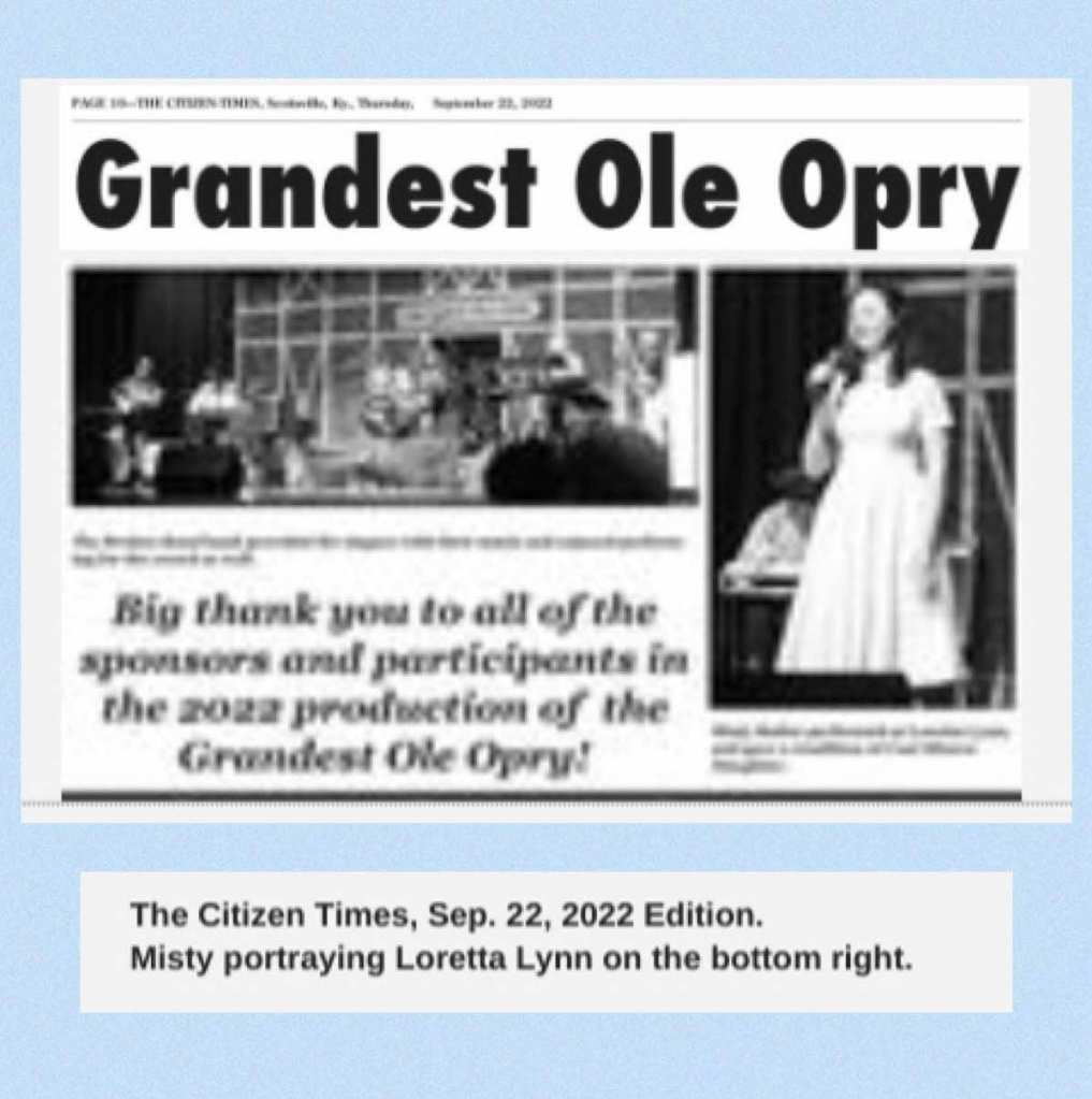 “Coal Miner’s Daughter” ~ Portraying Loretta Lynn in the Scottsville Opry, Sep. 2022: https://www.youtube.com/watch?v=9uK0CLSe9GM
